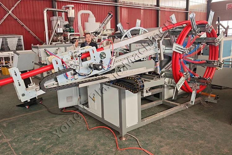 În 2025, am livrat cu succes două seturi personalizate de mașini automate de înfășurare a țevilor PE unei întreprinderi de top din Argentina de prelucrare a plasticului. Clientul a cerut soluții de înfășurare de înaltă eficiență pentru a se potrivi noilor lor linii de extrudare a țevilor din PE de mare viteză. Comanda a cuprins două unități specializate: o mașină de bobinat automată cu două stații optimizată pentru țevi cu diametrul de 15-32 mm și un alt model de mare capacitate proiectat pentru diametre de 20-63 mm. Aceste mașini se integrează perfect cu liniile de extrudare a țevilor PE de mare viteză pentru a înfășura automat țevile în role uniforme. Echipat cu un sistem de numărare automată a lungimii, mașina declanșează tăierea automată și transferul stației odată ce lungimea țintă este atinsă. Securizează simultan rola finită și activează o alarmă pentru ambalare, oferind o soluție de bobinare complet automatizată. Testele riguroase din fabrică înainte de expediere au asigurat o funcționare stabilă la fața locului după livrare.