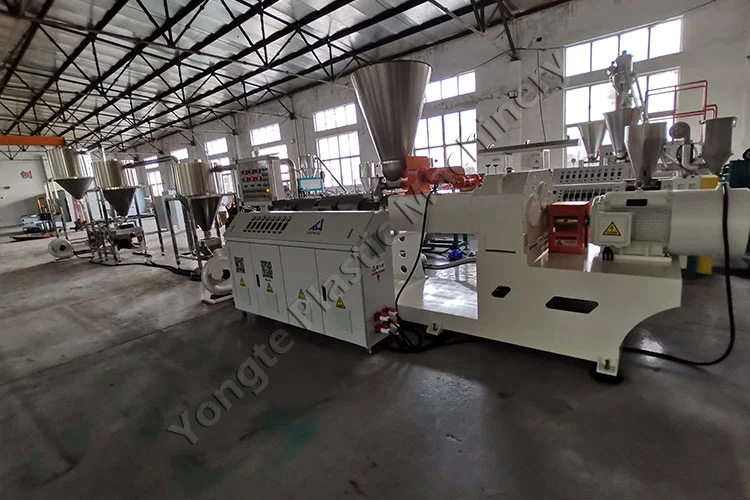 În 2024, am proiectat o mașină de peletizare a compusului PVC personalizat pentru un client polonez, special concepută pentru a produce granule de masterbatch PVC din PVC reciclat și umplutură CaCO₃. Conținutul de umplutură de CaCO₃ poate fi ajustat în mod flexibil între 40% și 80% pentru a se alinia cu specificațiile de producție ale clientului. Componentele cheie includ un alimentator automat, un extruder conic cu două șuruburi SJSZ80/156 (motor de 75 kW cu invertor de frecvență ABB, consumând ~ 50 kW în timpul funcționării stabile), o matriță de peletizare la cald pentru tăierea uniformă a granulelor și un sistem rapid de răcire și transport cu aer din oțel inoxidabil 304 în trei etape. Mașina atinge o capacitate de producție de 300-400 kg/oră și este construită pentru funcționare continuă 24/7, fără timpi de nefuncționare. Instalarea a fost fără probleme, susținută de echipa de experți a lui Yongte, care a oferit asistență completă. Instruirea post-instalare, la fața locului, a permis personalului clientului să opereze echipamentul cu competență, în timp ce suportul tehnic de la distanță prin ghidare video a asigurat rezolvarea promptă a oricăror probleme, menținând producția neîntreruptă și performanța de vârf.